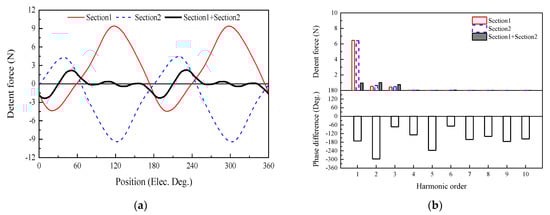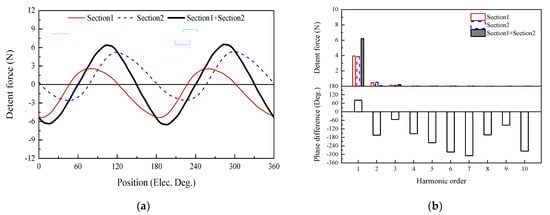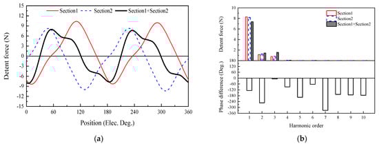 It is clearly shown in the frequency domain that the fundamental component is the most dominant for all the models. The most interesting observation in this comparison is that each section of Model 2 generates waveforms of which the fundamental components are the same in amplitude, but nearly 180 degrees apart in phase, as shown in Figure 6b. Due to the phase difference in the proposed design, the resultant detent force of Model 2 dramatically reduces, and this reduction method perfectly corresponds with what is expected in (3).
