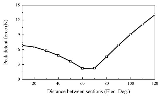 Figure 8 further illustrates the variation of peak detent force of Model 2 with respect to the distance between the sections. It should be noted that the peak detent force values at 60 degrees and 70 degrees are practically the same. However, placing the sections 60 degrees apart is the best choice because it maintains all phase windings in a perfect three-phase distribution.