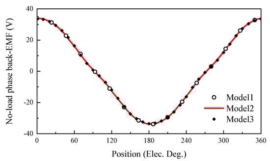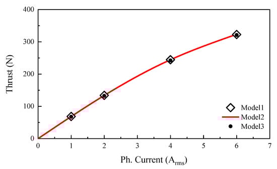 Figure 9 and Figure 10 compare no-load phase back-EMF waveforms and the thrust vs. phase current, respectively. It can be seen that the results of all the models are the same because their electromagnetic design parameters are the same. These results also correspond with the results discussed in [].