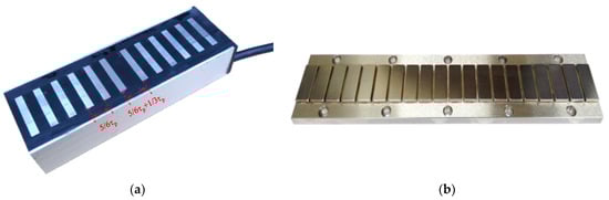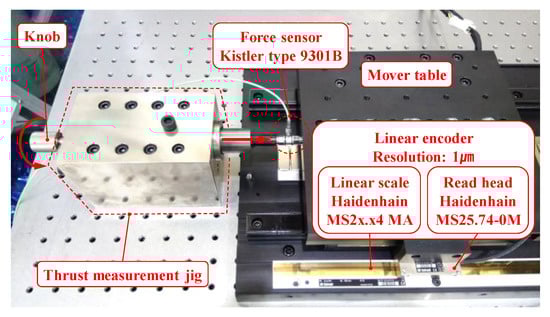 Figure 11 shows the prototype fabricated based on the analysis. It can be seen that the mover consists of two sections. To ensure mechanical strength and electrical insulation, the mover was covered with an Al case and encapsulated with epoxy resin, as shown in Figure 11a. The stator has no skewing design, as shown in Figure 11b. Figure 12 shows the test setup for thrust measurement, and Figure 13 shows the test setup for evaluation of the servo performance. This evaluation includes motion resolution, repeatability, and speed ripples [,,].