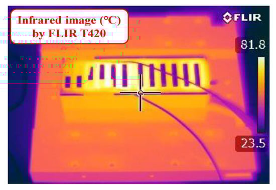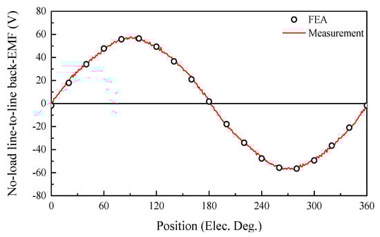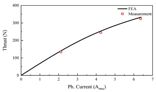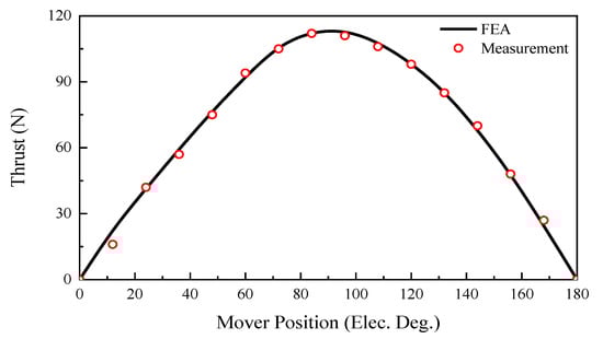 To confirm the validity of the analysis experimentally, the no-load line-to-line back-EMF was measured at 1.0 m/s and compared with the FEA result. Figure 14 shows excellent agreement. Figure 15 shows the static thrust waveform under DC current loading between phase U and V, and it also confirms the validity of the analysis. Figure 16 shows a comparison of thrust vs. current characteristics under several current conditions [,,]. It can be seen in Figure 16 that good agreement between analysis and measurement was achieved. Figure 17 is an infrared image that shows the temperature distribution under DC current loading of 2A between phase U and V. It was observed that the maximum temperature reached about 82.0 °C, which seems reasonable for diverse industrial applications.