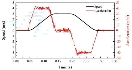Exemplary speed and acceleration profile measured by linear encoder feedback (speed = 3.0 m/s and acceleration = 40 m/s2).