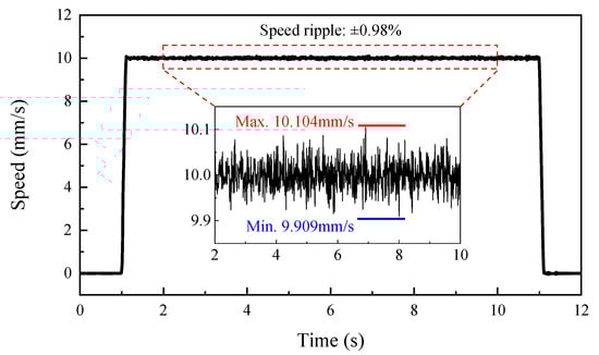 Figure 19 shows the speed ripple at 10 mm/s, as measured by the laser interferometer shown in Figure 13. This ripple was measured to be less than ±1%. This seems very low because the proposed design significantly reduces the detent force, adversely affecting the speed ripple at a low speed [].