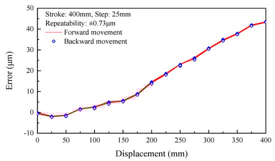 Figure 21 shows the measured bi-directional repeatability of the prototype tested according to the international standard ISO230-2:1997 []. It should be noted that the prototype achieves ±0.73 µm repeatability within a 400 mm stroke.