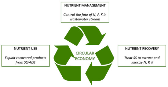 On the other hand, the uncontrolled discharge of high levels of nutrients into water bodies causes a serious deterioration of environmental quality, due to eutrophication. This is even more detrimental when considering that these are valuable resources that could be recovered and brought back into the material chain, in accordance with the circular economy model (Figure 1). This model addresses the scarcity of raw materials, by promoting recovery of residual flows, thereby reducing their disposal and environmental impact. The new Circular Economy Action Plan—one of the main blocks of the European Green Deal, Europe’s new agenda for sustainable growth—announces initiatives to foster sustainable consumption patterns and to ensure that resources are kept in the EU economy for as long as possible. In this framework, the EU Commission will consider reviewing directives on wastewater treatment and SS and will develop an integrated nutrient management plan, in order to ensure a more sustainable application of nutrients and to stimulate the market for recovered nutrients [13]. In view of this, handling SS is going to turn into a great opportunity, although some challenges still need to be tackled.