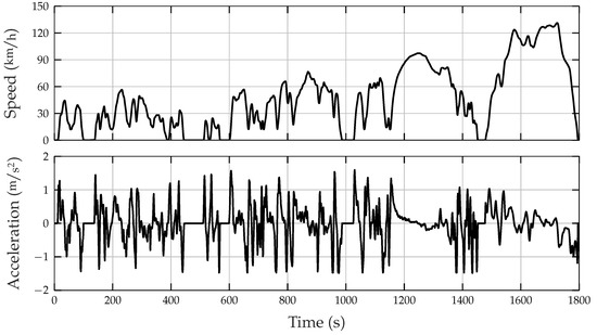 The simulation uses a quasistatic approach in which all state variables, such as the torque required at the wheel, remain constant for the duration of the time step. The driving cycle implemented is the worldwide harmonized light vehicle test cycle (WLTC) of Class 3 with a step resolution of 1 s, as shown in Figure 2.