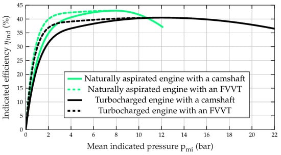 Figure 3 shows the models of the indicated efficiency of four different engines at an engine speed of 2500 rpm. The solid lines represent the indicated efficiency of the engines with a camshaft and are fitted to data obtained from measurements on the test benches. The dashed lines show the potential gain in efficiency if the engines are equipped with an FVVT. The first observation is that the FVVT allows the pumping losses to be reduced from approximately 0.4 bar to 0.2 bar for an operating point with . For the engine with the camshaft as well as for the engine with the FVVT, the pumping losses decrease linearly to a minimum of approximately 0.05 bar as the load increases. Second, an FVVT enables the engine to run part-load operating points in an x-stroke operation or with deactivated cylinders, which significantly increases the indicated efficiency as shown in [45]. The lines colored represent NA engines with a maximal value of of approximately 12.5 bar while the black lines represent TC engines with a maximal of approximately 22 bar. The studies with the FVVT conducted thus far were focused on the efficiency improvement in part-load operating points. Thus, an improvement in indicated efficiency is only achieved for operating points with a value of .