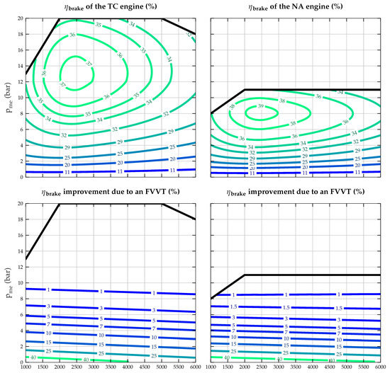 Resulting from Equation (5), Figure 4 shows the brake efficiency models on the left-hand side for a TC engine and on the right-hand side for an NA engine. The x axis shows the engine speed range in rpm while the y axis shows the mean effective pressure in bar. In the upper two plots the iso-efficiency lines show the brake efficiency in %, while in the lower two plots, the results show the brake efficiency improvement in % that is due to an FVVT.