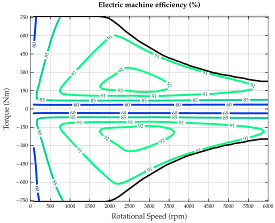 The efficiency map for the electric machine, i.e., the motor and the generator, is obtained from FEM simulations in MotorCAD. MotorCAD is a simulation software owned by AnSys which is specifically created to design electric machines. Figure 5 shows the efficiency map for a reference machine with a maximum power output of 150 kW. For the current investigation, the range of the rotational speed of the electric machine matches the possible engine speed. Investigations documented in [57,58,59] show that the efficiency maps of electric machines of varying power ranges look similar as long as the ratio of the constant torque to constant power region and the type of EM remain constant. Thus, for the variation of the DOH, the y axis, i.e., the torque output, of the reference map in Figure 5 is scaled accordingly.