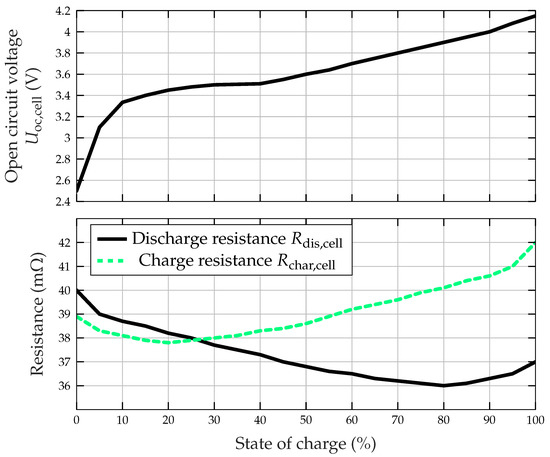 the open circuit voltage in V, the capacity in Wh, and the discharge and charge resistances and in , of the battery modules are calculated [61]. The number of required modules depends of the desired battery pack capacity . Subsequently, the open circuit voltage and the discharge and charge resistances and are modeled as follows: