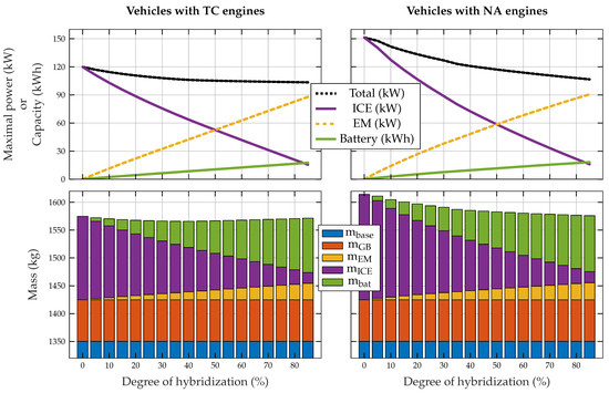 Effects of the degree of hybridization on the maximal power and the mass distribution of the vehicle and its components. The plots on the left-hand side show the results from vehicles equipped with a turbocharged ICE, while the plots on the right-hand side show the results from vehicles with naturally aspirated ICEs.