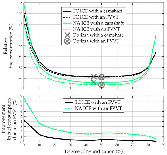 The upper plot in Figure 8 shows the relative fuel consumption over the DOH of all the engine concepts investigated. Here, all results are relative to the fuel consumption value of 100% of the vehicle with a camshaft-equipped TC engine at a DOH of 0%. Compared to the reference vehicle, the fuel consumption of an HEV with a DOH of 10% and a camshaft-equipped TC engine is reduced by approximately 22%. Most of the fuel-saving potential is exploited at a DOH of 25%, where a reduction of approximately 28% is achieved. The fuel-optimal HEV configuration is found at a DOH of 45% with a fuel consumption reduction of 29.2%. HEVs with an NA engine follow a similar tendency. However, at the same degree of hybridization, the fuel consumption of NA engines, on average, decreases by more than 2% further than it does for TC engines. A small degree of hybridization allows the operating points to be shifted towards peak efficiency, which for the modeled NA engine is approximately 2% higher than for the TC engine. Hence, an HEV with a camshaft-equipped NA engine at its fuel-optimal DOH of 45% reaches a fuel consumption reduction of approximately 31.9%. As stated above, in the case of NA engine-equipped HEVs the fuel-saving potential is exploited at a DOH of 25% with an achieved reduction of the fuel consumption of approximately 30%. Furthermore, for both TC and NA engines, an FVVT reduces the fuel consumption over the complete DOH range investigated. For greater detail, the lower plot shows the improvement in fuel consumption due to the FVVT over the DOH in %. These results are relative to their corresponding engine type, TC and NA, respectively. An FVVT reduces the fuel consumption by 4% to 9% for the ICEV at a DOH of 0%, which agrees with the results published in [62]. However, the benefit of an FVVT vanishes rapidly as the DOH increases. At a DOH of 10%, the reduction of the fuel consumption due to the FVVT reaches 3.6% at the most. For FVVT-equipped engines, the optimal HEV configuration is slightly shifted to a DOH of 50% for HEVs with a TC engine as well as for HEVs with an NA engine. At the fuel-optimal DOH, the FVVT improves the fuel consumption for HEVs with NA engines by 1.7% and for HEVs with TC engines by 0.5%. Since an FVVT affects the whole engine map of an NA engine, its positive effect is greater for NA engines than for TC engines.