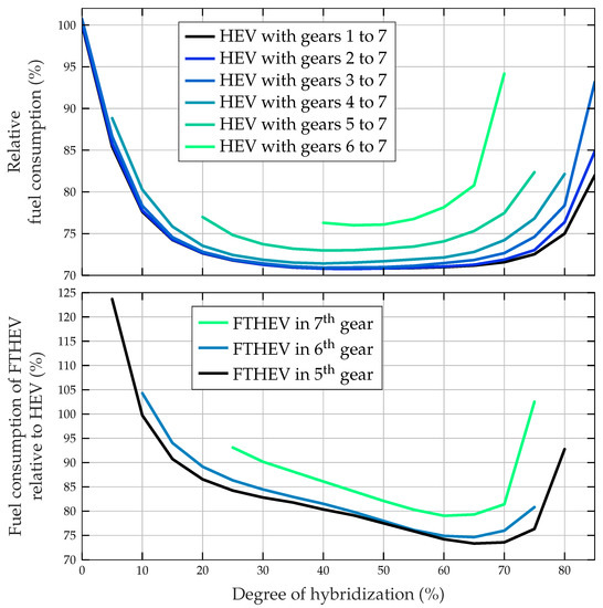 The bottom plot shows the fuel consumption of HEVs with a fixed transmission equivalent to the fifth, the sixth, and the seventh gear, respectively. Choosing a lower gear does not yield any feasible results since the maximal engine speed is exceeded due to the rather high peak velocities in the WLTC. Again, the results in this plot are relative to the fuel consumption of the camshaft-equipped TC ICEV, i.e., a DOH of 0%, with the gears one to seven available. In contrast to the upper plot, the acceleration performance is achieved with all vehicles, with each transmission ratio and at each DOH. The FTHEV in the fifth gear achieves its optimal fuel economy at a DOH of 65%, which diverges only by 3.6% from the fuel consumption of the reference HEV at the optimal DOH. In the sixth gear, the optimum of the FTHEV is found at a DOH of 65% as well and shows an increase in fuel consumption of 5.4% compared to the reference HEV at the optimal DOH. In the seventh gear, the optimum of the FTHEV is found at a DOH of 60% and the fuel consumption increases by 11.7% compared to the reference HEV at the optimal DOH. The increase in fuel consumption towards a DOH of 0% for all transmission ratios analyzed stems from the significant increase of the required total propulsion power in order to achieve the desired acceleration performance with a fixed transmission ratio. The mass of an FTHEV in the fifth gear and at the optimal DOH is reduced by 1.7%, which is mainly due to the removal of the gearbox. However, to ensure the acceleration performance an increase in the total propulsion power by 27% is required, which partially compensates for the advantages due to the lighter transmission.