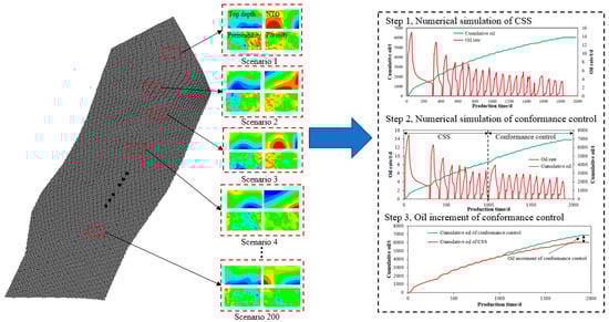Valid and extensive data are mandatory for the construction of a reliable prediction model based on supervised learning methods [45,46,47]. In this study, the datasets were constructed by numerically simulating the CSS and the subsequent conformance control process, based on the geological feature and fluid property of the Southern P601 block of the Chunfeng Oilfield [48].