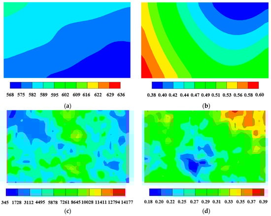 Distribution of top depth, NTG, permeability and porosity of the reservoir model. (a) Top depth distribution (579 m in average), (b) net to gross ratio distribution (0.47 in average), (c) permeability distribution (5405 mD in average), (d) porosity distribution (0.31 in average).