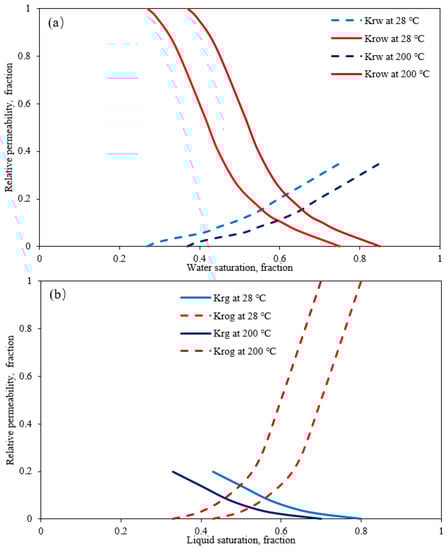 The injection of high-temperature steam into heavy oil reservoirs tends to reduce the oil viscosity and enlarge the two-phase flow span of relative permeability curves [52]. The dependence of oil viscosity on temperature is shown in Figure 3. For relative permeability, we defined saturation endpoints at different temperatures (Figure 4), and then relative permeability can be determined by endpoint scaling due to the similarity [53]. The heat loss through the roof and ceil layers was considered using the semi-analytical infinite-overburden heat loss model that was proposed by Vinsome, P.K.W. [54]. Key thermal parameters of the reservoir and formation fluids are given in Table 2.