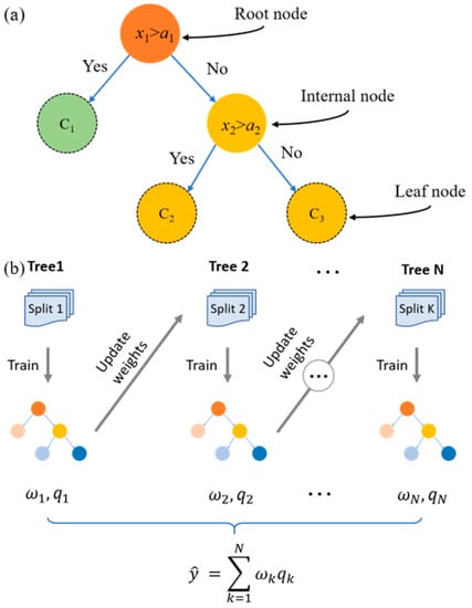 Illustrations of the (a) CART model and (b) boosting ensemble trees [46,47].