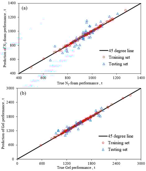 Cross plots of the true and prediction profile control oil increment using the XGBoost for the (a) N2-form and (b) gel.