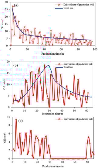 The production performance of three categories of wells. (a) The wells of relatively initial high oil production rates and subsequent sharply decreasing trends. (b) The wells of a gradual climbing trend of oil rates in the initial cycles and then a decreasing trend. (c) The wells of relatively low oil rates throughout the production life span.