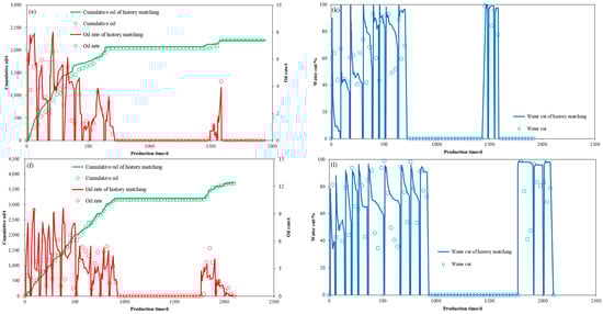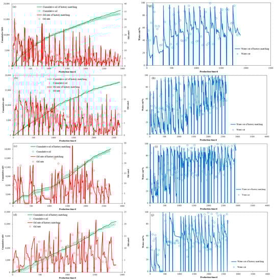 A number of six horizontal wells with production characteristics that can be categorized into one of the above three types were picked out from the target block. History matching and subsequent conformance control simulations were conducted for these wells (Figure 8). For each well, the properties for the N2-foam and gel were assigned with the same identical values as previously set. Operational parameters associated with N2-foam were set with an injection rate and total injection volume of 10,000 m3/d and 0.2 PV, respectively. Operational parameters associated with gel generation were the injection of polymer and xlinker, which were 0.2 PV and 0.02 PV, respectively.