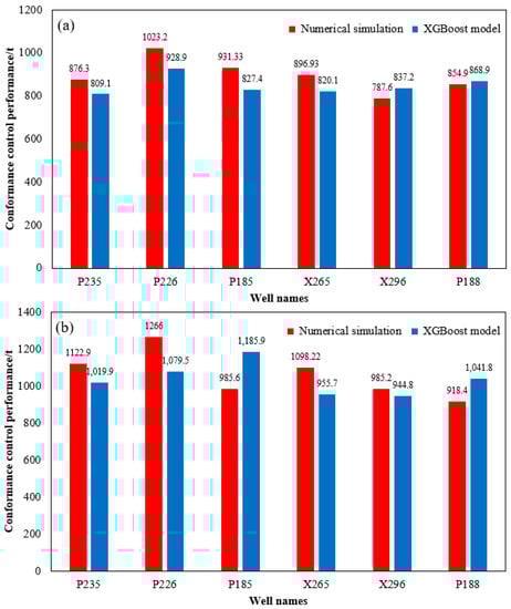 Comparisons of prediction results for profile control potential using the numerical simulation and XGBoost prediction model. (a) Potential of N2-foam profile control. (b) Potential of gel profile control.