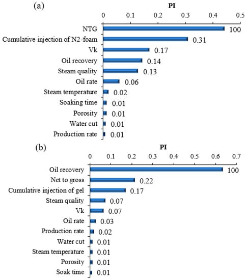 Figure 10a showed that the NTG has the highest PI value and exerted the most significant influence on the potential of N2-foam conformance control among all the factors investigated. The net to gross can affect the value of geological reserves; therefore, the geological reserves can make a great impact on the potential of N2-foam conformance control. The PI of the N2-foam injection and variation coefficient of permeability are comparable, which are slightly higher than that of oil recovery and steam quality. The variation coefficient of permeability affected the degree of stratigraphic heterogeneity, and the heterogeneity, to some extent, impacted the potential of N2-foam conformance control. The steam quality can influence oil recovery of thermal recovery in the heavy oil reservoir, so the PI of steam quality was similar to that of oil recovery. The PI of the oil rate was less than the PI of the parameters mentioned above, and the oil rate can also affect the potential of N2-foam conformance control. The injector temperature, soaking time, porosity, water cut and production rate has the lower PI among all factors investigated and these parameters had little influence on the potential of N2-foam conformance control. As a summary, the ranking of input variables in terms of decreasing importance to the potential of N2-foam conformance control was net to gross>>N2-foam injection> variation coefficient of permeability>oil recovery>steam quality>oil rate>injector temperature>soaking time>porosity>water cut>production rate.