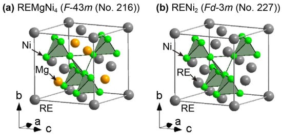 REMgNi4 adopts a face-centered cubic (FCC) structure (AuBe5 type) in the space group F-43m (No. 216) with Z = 4, which resembles a Laves phase alloy with a C15-type (MgCu2 type) crystal structure in the space group Fd-3m (No. 227) with Z = 8. The crystal structures of REMgNi4 and a Laves phase alloy, RENi2, with a C15-type crystal structure, are illustrated in Figure 1.