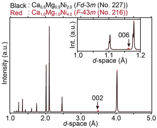Simulated X-ray diffraction patterns of (black) Ca0.5Mg0.5Ni2.0 in the space group Fd-3m (No. 227) and (red) hypothetical Ca1.0Mg1.0Ni4.0 in the space group F-43m (No. 216). For the simulation, Cu Kα radiation (wavelength λ = 1.5406 and 1.5444 Å for Kα1 and Kα2, respectively) was used. For the simulation, unit cell parameters of (Ca, Mg)Ni2 were used [14]. Inset shows an enlarged pattern at 1.0 ≤ d ≤ 1.2 Å of the X-ray diffraction of Ca0.5Mg0.5Ni2.0 and Ca1.0Mg1.0Ni4.0. (002) and (006) reflection, which are the systematic absence of the space group Fd-3m (No. 227), are indicated by arrows.