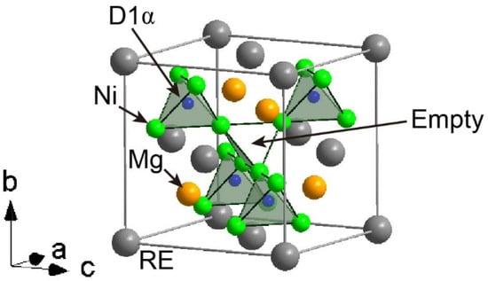 Crystal structure of α hydride based on LaMgNi4D0.75 [24]. The RE, Mg, and Ni D atoms are represented by grey, orange, and green spheres, respectively. The corner-shared tetrahedra formed by four Ni atoms are represented as the green polyhedra. The D atoms in the crystal structure are indicated as D1α.