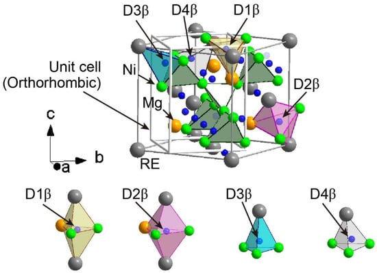 Crystal structure of β hydride, based on Y1.06Mg0.94Ni4.00D3.86 [20]. The Y, Mg, and Ni D atoms are represented by grey, orange, and green circles, respectively. Parts of Mg atoms are replaced by Y atoms. The corner-shared tetrahedra formed by four Ni atoms are represented as the green polyhedra. The original orthorhombic unit cell is represented as white line. The grey lines connect the Y atoms in Y1.06Mg0.94Ni4.00D3.86 to compare it with the unit cell of REMgNi4 (Figure 1). In the local atomic arrangements around the D atoms, the hydrogen sites in the triangular bipyramid, and the tetrahedra are represented as yellow (D1β), pink (D2β), cyan (D3β), and green (D4β) polyhedral, respectively.