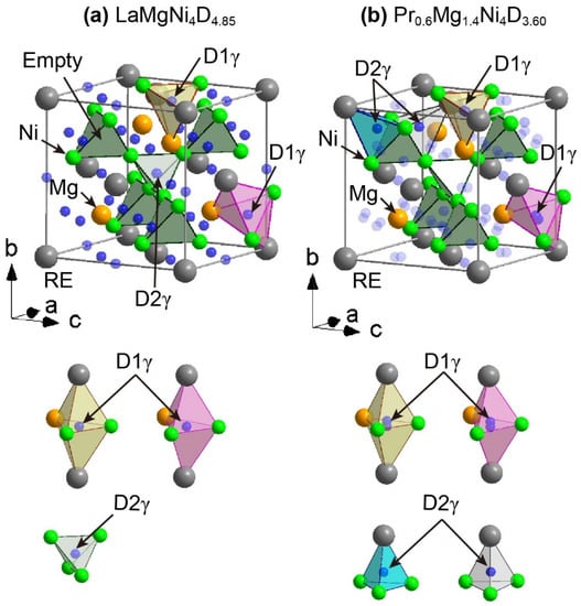 Crystal structures of γ hydride phases based on (a) LaMgNi4D4.85 [24] and (b) Pr0.6Mg1.4Ni4D3.60. [28]. The La (Pr), Mg, and Ni D atoms are represented by grey, orange, and green spheres, respectively. Parts of Pr atoms are replaced by Mg atoms in Pr0.6Mg1.4Ni4D3.60. The corner-shared tetrahedra formed by four Ni atoms are represented as the green polyhedra. The original orthorhombic unit cell is represented as white line. In the local atomic arrangements around the D atoms, the hydrogen sites (D1γ) in the triangular bipyramid are represented as yellow and pink polyhedra. In the local atomic arrangements around the D atoms, the hydrogen sites (D2γ) in the tetrahedra are represented as green (LaMgNi4D4.85), cyan (Pr0.6Mg1.4Ni4D3.60), and grey (Pr0.6Mg1.4Ni4D3.60) polyhedra.