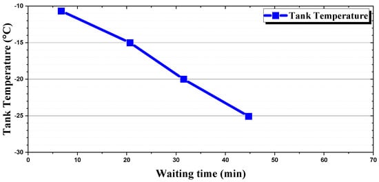 The urea water solution (UWS), used as a reducing agent in urea–SCR systems, contains 32.5%, and its freezing point is approximately −11 °C [16]. For this reason, the supply of the reducing agent may be hampered owing to the freezing of the UWS in the climates of northern Europe or North America, where the ambient temperatures are lower than the freezing point of the solution. In this case, because the UWS is not supplied, proper SCR system operation is hampered, which may lead to significant NOx emission. Due to this problem, the United States Environmental Protection Agency (US EPA) requires that UWS spray be supplied from completely frozen UWS approximately 20 min after an engine is started (depending on the tank temperature) when the ambient temperature is −16 °C, as shown in Figure 1 [17].