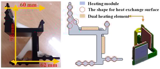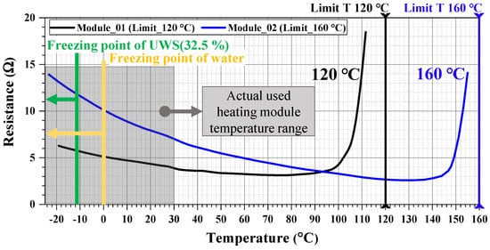 Two types of heating modules were used in this study, and they were classified depending on their characteristics of resistance to temperature. The heating elements of Module_1 and Module_2 had temperature limits of approximately 120 °C and 160 °C, respectively, and the specifications of the module and the elements are summarized in Table 1. Figure 4 shows resistance measured based on the temperatures of two types of heating elements. The resistance of each element increased rapidly when the temperature was close to 120 °C and 160 °C, respectively. In addition, convergence to the limited temperature occurred within a short time by using a thermocouple and an IR camera to confirm the heat transfer characteristics to the entire module.