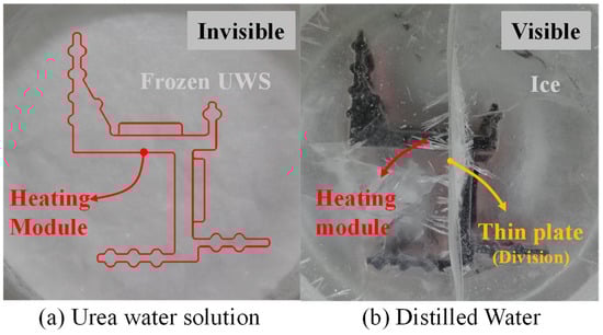 The photograph in Figure 5 shows the frozen state of the UWS, the melting characteristics of which are observed herein. Figure 5a shows the frozen state of the UWS, and Figure 5b shows the frozen state of water (H2O). In Figure 5a, UWS is very opaque and white in color when frozen, and it is impossible to observe what lies below its surface and any changes that occur over time in the melting process. However, as shown in Figure 5b, when water (H2O) is used, it is relatively easier to observe the melting shape and characteristics. For this reason, except for some conditions considered in the test conducted to measure the mass of melt, distilled water (H2O) was used as a solution to study the melting shape characteristics during the melting process (water level and heating module). The density and enthalpy of distilled water and UWS at the same temperature are shown in Table 2. To simulate UWS frozen inside a real tank, UWS was artificially frozen inside a freezer that can reduce the temperature to less than −20 °C. To examine the shape of melting, the inside of the acrylic chamber was divided using thin plates when the solution was in the liquid state. Subsequently, the chamber containing the liquid and the dividing plates was placed in the freezer. To initiate the melting process, power was supplied to the heating module for a predefined period of time. Thereafter, the unmelted part was removed from the chamber, and its shape was examined. The amount of melted solution was measured using a weighing scale with a resolution of 1/1000 g (AND GX-1000).