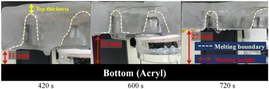 Figure 7 shows an image of the melting shape at 420 s in Case_1 and a schematic diagram explaining the melting process in detail. The test results confirmed that the solution temperature increased relatively rapidly in regions close to the heating module, and the solution in these regions melted first. At this time, buoyancy was generated because of the temperature difference generated during the melting process, and the melted solution traveled upward along the module. In this process, if the ambient air temperature (test condition temperature: approximately 25 °C) was similar to or higher than the temperature of the melted solution, heat loss was delayed, or heat inflow occurred. Thereafter, heat loss occurred again, reaching the frozen solution that had not been melted, and it sank to the bottom. This behavior can be ascribed to typical buoyancy-driven convection due to temperature difference, and the upper part of the module melted in a wide-open shape as it proceeded in the order of ①-②-③, shown in the schematic diagram.