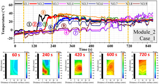 Figure 11 shows a two-dimensional representation of the temperature change and distribution characteristics around the heating module with the passage of time after the application of power. A total of nine sensors positioned at regular intervals around the module, as shown in Figure 6, were used to check the temperature characteristics. The right side of Figure 6 shows a two-dimensional representation of the positions of the installed sensors when the module is viewed from the bottom. Ignoring the z distance of each sensor, the positions are expressed by projecting them on the x-y plane. In this case, because points 5 and 8 are expressed as the same point, we used these two points as the average of the two measured values. In order to confirm the relationship between the melting shape and temperature, the test was conducted using only Module_2, the element temperature of which was limited to 160 °C, and the level conditions were those corresponding to Case_1 and Case_2. In addition, data were acquired at 60, 240, 420, 600, and 720 s after the start of melting to determine the temperature distribution at each time. As the melting proceeded after power was supplied, it was confirmed that the temperature around the module (the part close to the module) increased relative to that in the part far from the module. Overall, we confirmed that the temperature increased rapidly when the phase change was completed, especially after the rate of temperature increase due to phase change decreased to near 0 °C. This trend can be ascribed to the anomalous behavior of water, which was the solution used herein, near 0 °C. Although UWS mostly consists of water, its freezing and melting point is −11.7 °C, meaning that one can expect to observe the above-described anomalous behavior at a temperature close to −11.7 °C.
