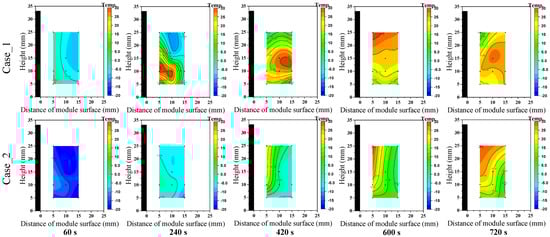 According to the results of the two cases shown in Figure 12, the initial melting proceeded similarly, but the same temperature boundary in the x direction was narrower in Case_2 than it was in Case_1. This is because the heat loss in the upper part of the module was large, and for this reason, the melted solution on the upper part did not spread wide and descended faster toward the bottom. Although there was heat loss in Case_1, we confirmed that the temperature spread over a wide shape because the ambient temperature was room temperature. In Case_1, the temperature boundary was not clearly distinguishable from 600 s onward, which seems to indicate that the temperature difference between the melted upper solution and the unmelted solution was not large due to heat inflow from the outside and relatively low heat loss. By contrast, in Case_2, the upper-temperature boundary was clearly maintained even at 600 s and 720 s, meaning that the temperature difference was maintained owing to rapid heat loss.