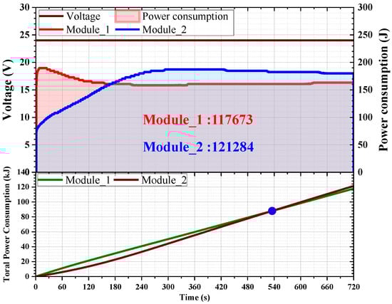 The graph in Figure 13 shows the power consumed over time since the start of the power supply to each heating module. The power consumed by Module_1 at the start of heating increased rapidly as soon as power was switched on, and then, it decreased gradually. On the contrary, Module_2 did not consume much power initially compared with Module_1, and the power consumption increased gradually over time. This phenomenon can be ascribed to the fact that the current changes with temperature owing to the resistance characteristics of the heating element (PTC), as described in Figure 4. Therefore, the maximum temperature of Module_1 was lower than that of Module_2. However, Module_1 consumed a considerable amount of power in the initial heating period, whereas the power consumption of Module_2 increased gradually with the passage of heating time. This finding confirmed that the power consumption of Module_1 was higher than that of Module_2 after approximately 180 s since the start of the power supply; thereafter, the power consumption of Module_2 was higher.