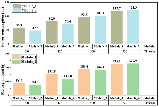 High power consumption indicated that a large amount of energy was used for melting, and power consumption and amount of melted solution exhibited similar trends. In addition, the total power consumption of Module_1 and Module_2 was the same over approximately 540 s, and the masses of melt were similar at 600 s. Table 3 lists the power consumption and the masses of melt with the passage of heating time.