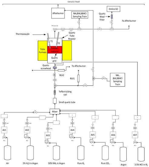 This study used a fixed bed reactor system with an inside diameter of 40 mm and length of 815 mm as shown in Figure 1. In each experiment, the reactor tube located inside an electronic furnace was packed with 200 g heat-treated sorbent material (CaO-Fe2O3) which was kept in place with wool on top. The sorbent material was firstly calcined into CaO at the temperature of 850 °C, and then reduced with H2 for 40 min at the same temperature. Afterwards, the reactor was cooled to the target carbonation temperature and, once this temperature was reached, the simulated producer gas was injected. The simulated producer gas consists of H2 (30 vol.%), CO2 (25 vol%) as well as contaminants of HCl at 200 ppmv, H2S at 230 ppmv, and NH3 at 2300 ppmv with the remaining being Ar as shown in Table 1 which also includes HHV and HHVO values of the feeding gas. Ar was included in the feeding gas instead of N2 to avoid potential reactions between N2 and H2 to form NH3.