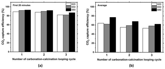 Figure 2 shows the average CO2 capture efficiencies at three different carbonation temperatures from the feeding gas with contamination of H2S, NH3, and HCl. Figure 2a illustrates the results for the first 20 min of carbonation, while Figure 2b shows the results in the entire carbonation process. From Figure 2a,b, it is found that the CO2 capture efficiency increased as the carbonation temperature increases, but declined over repeated cycles. At the carbonation temperature of 680 °C, the CO2 capture efficiencies throughout the initial 20 min were 93%, 92%, and 87%, respectively, for the first, the second, and the third cycles. Similarly, for the entire carbonation stage at 680 °C, the corresponding CO2 capture efficiencies were 77%, 68%, and 62%. In the same way, the effective CO2 capture efficiency at 650 °C in the initial 20 min was 92%, 90%, and 82%, with the corresponding values for the entire carbonation stage being 62%, 59%, and 58%. The CO2 capture efficiencies in the initial 20 min at carbonation temperature of 620 °C were 89%, 88%, and 81%, and in the entire carbonation stage these were 64%, 55%, and 53%, respectively.