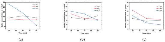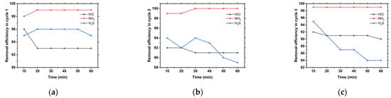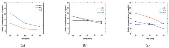 As observed in Figure 3a–c, the HCl removal efficiencies at the carbonation temperature of 650 °C maintained at a relatively high level, above 90%, which did not show a clear change with cycling. Similar results could also be noted for H2S removal efficiencies, 95–96% for the first cycle, 89–94% for the second cycle, and 84–95% for the third cycle. These values were higher than those observed in the previous study for combined contaminants of H2S and NH3 [43]. Similarly, the NH3 removal efficiencies were also improved with values being 98–99% for the first cycle, 99–100% for the second cycle, and 99% for the third cycle. On average over the three cycles, the removal efficiencies 92.1% for HCl, 99.2% for NH3, and 91.9% for H2S. Correspondingly, the concentrations of the released contaminants in the CO2-enriched gas stream were 9–14 ppmv for HCl; 5–28 ppmv for H2S and 7–21 ppmv for NH3 for three cycles of the experiment as shown in Figure 4.