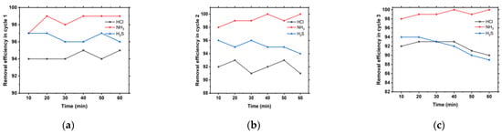 The contaminant removal efficiency in the carbonation stage at 650 °C for the first (a), the second (b), and the third cycle (c).