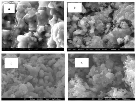 The above findings can be further confirmed by the observation of SEM image which are shown in Figure 7. Figure 7a is the image of the fresh sorbent material, Figure 7b is the image of used sorbent material tested with the feeding gas without any contaminant, Figure 7c is the image of used sorbent material with the feeding gas with contaminants of NH3 and N2S whereas Figure 7d shows the image of used sorbent material tested in the present study. It is observed that the sorbent surfaces with HCl contaminant had more voids that interconnect with each other. This porous structure after chlorination promotes effective solid–gas interaction on the surfaces and thus resulting in higher reactivity. It confirms that the addition of HCl in the feeding gas during the carbonation stage improves the pore structure which is directly related to the improved CO2 capture and contaminants removal.