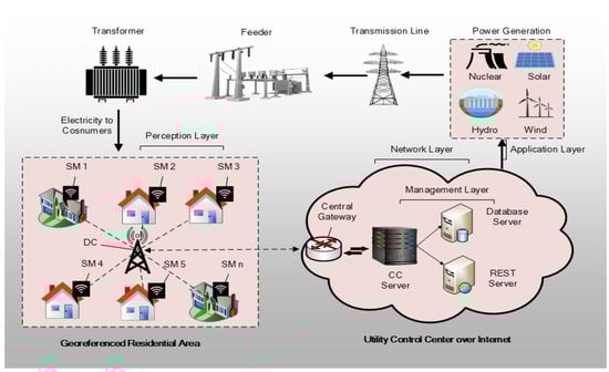 The communication methods of the AMI network are mostly similar to those of the most recently emerged IoT communication models [15,16,17,18,19], utilizing several communication standards (cellular, WiFi, etc.), multi-layered structures (fog, edge, cloud), and protocols to provide remarkable end-to-end IoT services in the SG system with lower cost, increased coverage range, and lower power consumption. Recent developments in the leading LPWAN wireless technologies [9] such as NB-IOT [15] and long-range radio (LoRa) [16] are specially designed to enable low-power devices (e.g., SMs) to communicate over a long range with the control center (CC) for Internet-connected applications (e.g., metering, monitoring, etc.). In this way, the CC fully exploits the features of the Internet of things (IoT) to access SMs at customer premises remotely, to obtain accurate energy consumption data [20]. In particular, the CC should be able to adjust the energy supply according to the real-time demands of the consumers. Therefore, an intelligent communication system is required between SMs and the CC that will enable the SG network to handle the dynamic changes in electricity demand and supply in the electrical network.