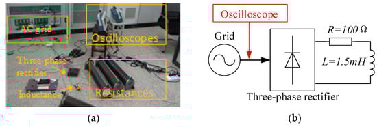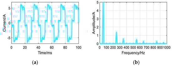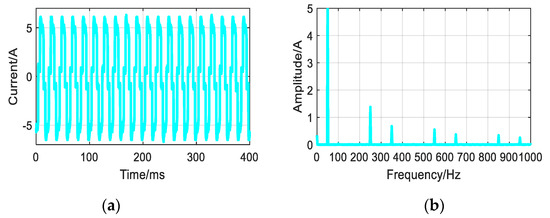 As an experimental example, we sample the AC distorted current signal. Experiment platform consists of AC grid (380 V, 50 Hz), oscilloscope (Tektronix GDS−2102) and nonlinear load (the three−phase rectifier, R = 100 Ω and L = 1.5 mH). It is shown in Figure 2. The AC current signals are sampled by the oscilloscope. Sampling cycles are selected as 10 µs and 40 µs. The experiment sampling current data and spectrogram are shown in Figure 3 and Figure 4. The HRI of harmonic components are measured to be approximately 24% of 5th, 10% of 7th, 10% of 11th, 5% of 13th, 5% of 17th, 4% of 19th by spectrum analysis.