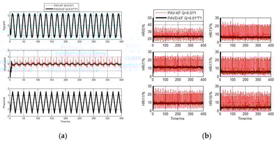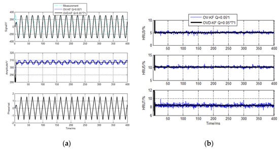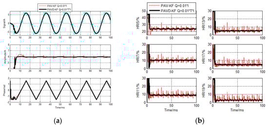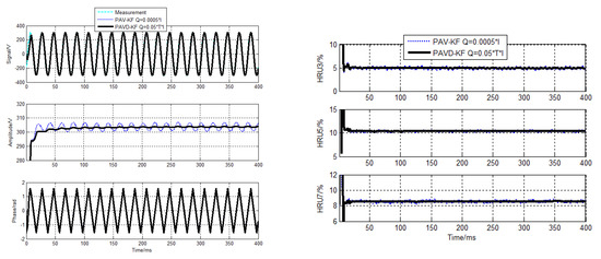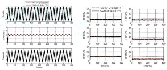 Corresponding to it, when Q combines with the sampling cycle, Q = 0.01 × T × I, regardless of the fundamental or harmonic components, the proposed detecting accuracies in PAVD−KF and OVD−KF algorithm are much higher than the conventional algorithms.