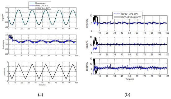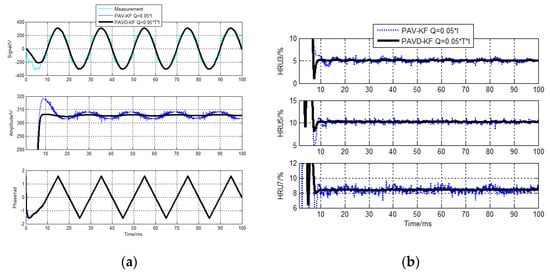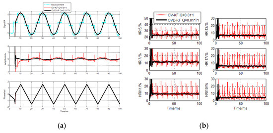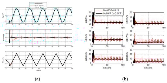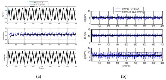 The Kalman filter (KF) plays an increasingly important role in the real−time detection of grid AC signal [1]. It was first applied to the power signal processing field by Dr. A. A. Girgis in 1981 [2,3,4]. It mainly applies to the following fields: fundamental and harmonic components detection of grid voltage/current [5,6,7,8,9,10], phase−locked loop synchronization [11,12,13,14,15], power quality detection and compensation equipment [16,17,18,19,20], power disturbance feature extraction and machine classification [21,22,23,24], and etc. In these applications, two conventional models, phase angle vector (PAV) model and orthogonal vector (OV) model, are mainly used. The phase angles were used as vectors to establish a state-space model which could be called the phase angle vector (PAV) model through cosine expansion [3]. The orthogonal vector was used to establish a state-space model that could be called the orthogonal vector (OV) model [4]. However, the state noise covariance of the two models is only a given value based on empirical statistics of the AC signal. It is selected as a fixed value, such as Q = 0.05 × I (I represents the unit matrix), when AC signal is the grid voltage [10,11]. It is selected as a fixed value, such as Q = 0.01 × I, when the AC signal is the sampling current [20]. It is mainly to avoid big tracking error and enable to detect response without time delay. With the development of computer hardware and sensor technology, the sampling cycle is getting smaller, and the accuracy requirements are getting higher. The detecting accuracy of the fundamental and harmonics components for the conventional detecting model−based KF algorithm cannot meet the requirements of modern engineering applications.