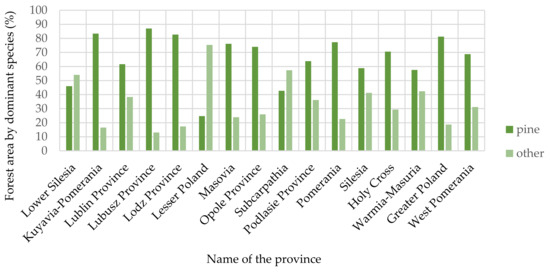 As a part of the European Union, Poland is a powerful participant in the new European Green Deal which will be a revolution from the point of view of the Polish energy sector. In the future years, new climatic and environmental legislation will provide new obstacles. The Polish energy sector is now confronted with significant issues. The primary issues confronting this sector include high energy consumption, insufficient infrastructure development, production and transportation of fuels and energy, extraction of external energy natural gas, and rising CO2 pricing. Amongst renewable energy sources, thermodynamic and numerical modeling aspects of biomass torrefaction are characterized by unflagging interest. As part of the research, a thermogravimetric analysis was performed on the basis of which the kinetics of chemical reactions taking place during the process were determined. Additionally, measurements of the total volatile organic compounds from the process were carried out and the combustion data were determined for the torrefaction products obtained. The research was carried out as part of the BIOCARBON project, which aims to design a torrefaction installation equipped with a rolling-bed dryer operating in continuous air mode and a reactor using superheated steam for the torrefaction process. Poland is at the forefront of Europe when it comes to forest area. Currently, the forest area in Poland is over 9.3 million ha. Pine is the most common species in lowland and upland areas. According to the Large-Area Inventory of the State of Forests, pine grows on 60% of the forest area of the state forests and approximately 54% of private and communal forests [1]. Pine’s dominance results from the way in which forest management was conducted in the past [2,3,4]. The detailed percentage of pine forest area broken down by voivodeships of Poland is presented in Figure 1.