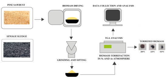 During this process, the lignin contained in the biomass heats up under the pressure applied and becomes soft and plastic. In this way, the material can be formed into any shape which allows for easy processing and transportation. As a result of the process, the moisture content of the material decreases, and the calorific value increases. The pelletizing process gives the pine wood fuel properties [5,6,7,8,9]. However, in order to be able to fully use pine wood as fuel, it must be subjected to further technological processes. An important direction of development concerns large-scale processes aimed at the preparation of biomass, where, in addition to drying, briquetting, baling, or pelletization, biomass is also subjected to processes aimed at altering its physical character and changing its moisture content. One such process is torrefaction. It can be said that torrefaction is a process of preliminary thermo-chemical processing of biomass under an inert atmosphere [10,11,12,13,14,15]. Its main task is to approximate the properties of biomass to the properties of average coals [16]. Sewage sludge is considered to be one of the many harmful substances produced by man. In short, it consists of suspensions of various waste substances in water, discharged from industrial plants and households. Unfortunately, it contains significant amounts of chemical compounds, bacteria, and microorganisms harmful to the environment. Therefore, in order to get rid of harmful substances, it must be treated. As certain technological (biological-chemical) processes are carried out, along with the removal of pollutants, sewage sludge is formed. This includes wastes that need to be treated and managed, and interestingly enough these can be a source of additional fuel due to their properties. Torrefaction is a thermo-chemical treatment of biomass at a temperature range of 200–300 °C; many researchers have done research on woody biomass torrefaction process and its influence on the woody biomass molecular structure [17,18,19,20,21,22,23]. It comprises a process that leads to an increase in biomass energy density, mainly as a result of decomposition of the reactive component of biomass, as in hemicellulose under anaerobic conditions [24,25,26,27,28,29,30]. During this process, about 30% of the initial weight of the raw material is reduced. This is mainly due to the removal of moisture from the material, but also the release of volatile substances. Due to the carbonization of biomass taking place during torrefaction, the biomass obtains properties that make it similar to coal [31,32,33,34,35]. Torrefied biomass is used not only as a renewable fuel in the energy sector [36,37,38,39,40,41,42,43,44]. Due to its developed specific surface and microporosity, it can also be used in environmental protection to remove pollutants from water and sewage [45,46]. Another sector of use concerns agriculture. The addition of torrefied biomass to the soil improves its properties and may contribute to reducing the use of fertilizers and plant protection products. It can also increase the effectiveness of using natural fertilizers [47,48,49,50]. Due to its very low thermal conductivity and absorption properties, torrefied biomass is also used in construction to produce insulation [51,52].